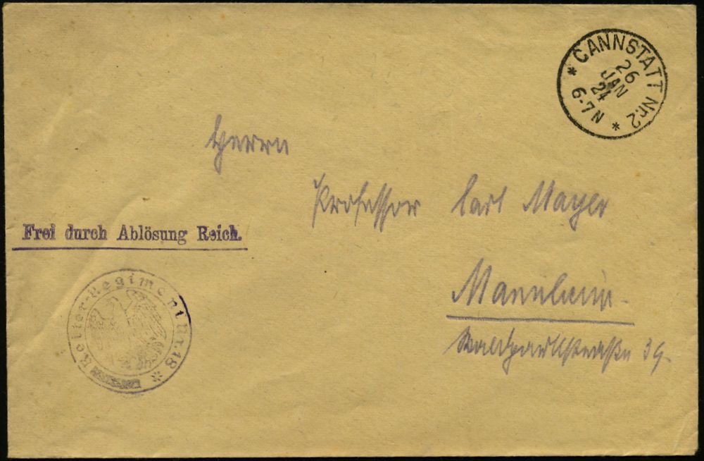3140 | 18 € | 7000 Stuttgart Allgemeine Belege : Stuttgart-Bad Cannstatt 1924 (26.1.) 1K: CANNSTATT Nr. 2/** + viol. 1L: FdAR + aptierter 2K: Reiter-Regiment Nr. 18 ,1 Wort geblockt ! (aptiert) klar gest. Reichswehr-Dienstbf. | ![]() | |