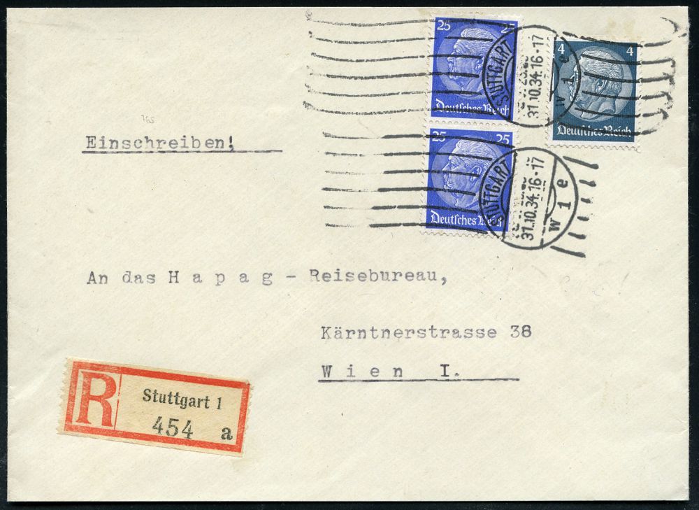 3143 | 20 € | 7000 Stuttgart Allgemeine Belege : STUTTGART/ w 1 e 1934 (31.10.) 2x Roll-WellenSt m.kl.1K-Kopf auf Hindenbg. 4 Pf. u. 2x 25 Pf. + RZ: Stuttgart 1/a, Ausl.-R-Bf. mit Roll-WellenSt. entwertet ist selten!, n.Wien = Inl.-Tarif! (Mi.514, 2x 522) | ![]() | |