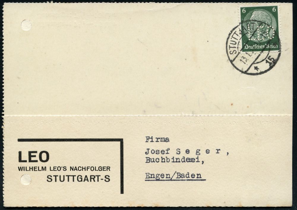 3146 | 14 € | 7000 Stuttgart Allgemeine Belege : STUTTGART/ *15* 1937 (13.1.) 1K-Brücke af EF 6 Pf. Hindenburg, grün mit Firmenlochung: L E O = lateinisch "Löwe" (Fa. Wilh. Leo = Hersteller für Buchbinderei-Bedarf (Reg.-Lochung geschl.) n. Engen (Mi.516 EF Perfin) | ![]() | |