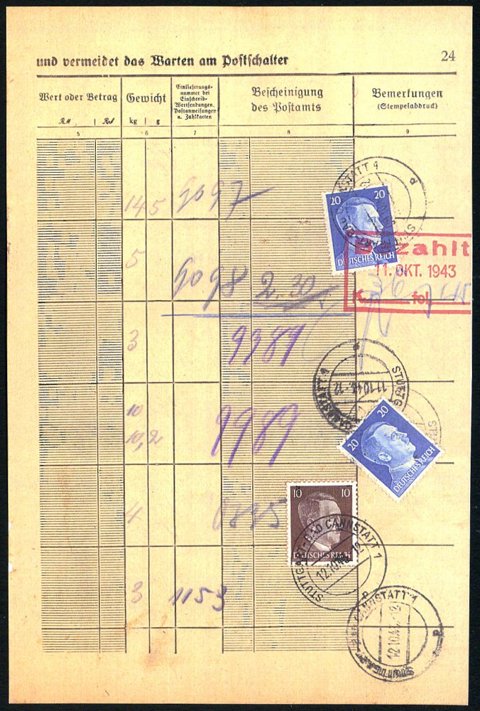 3148 | 40 € | 7000 Stuttgart Allgemeine Belege : STUTTGART-BAD CANNSTATT 1 1943 (Okt.) 2K-Steg auf Hitler 1x 10 Pf. u. 2x 20 Pf. auf Paketeinlieferungs-Heftseite = Paketgebühren! (Format A5) roter Ra.3: Bezahlt.., seltenes Dokument!, seltene Formular-Frankatur! (Mi.2x 791 ,826) | ![]() | |