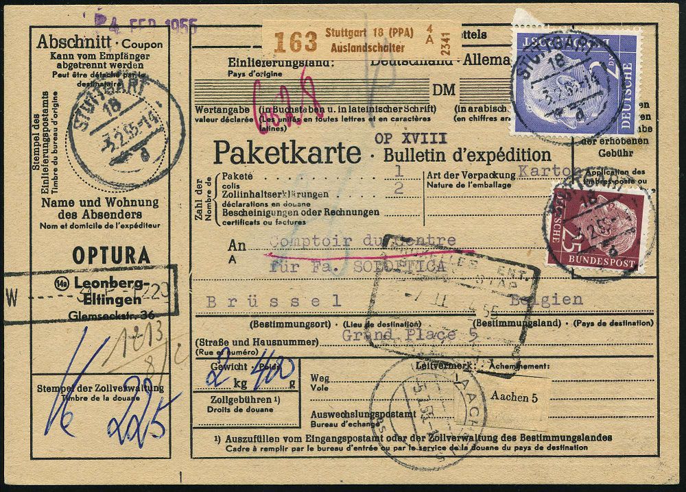 3157 | 20 € | 7000 Stuttgart Allgemeine Belege : STUTTGART/ 18/ d 1955 (3.2.) aptierter 1K-HWSt = Text "Stadt der Auslandsdeutschen" entfernt (Bo.56 apt.) Heuss 25 Pf. u. 2 DM + brauner Paketzettel: Stuttgart 18 (P P A) / Auslandsschalter + Leitzettel: Aachen 5 + 2K., Ausl.-Paketkt. n.Brüssel (Mi.186, 195) | ![]() ![]() | |