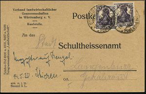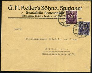 3138 | 16 € | 7000 Stuttgart Allgemeine Belege : STUTTGART 1 1923 (11.5.) 1K-Brücke auf 20 Mk. Posthorn u. 100 Mk. Ziffer, je mit Firmenlochung: K S / R = K eller´s Söhne, Zweigstelle Rentenanstalt, Firmen-Fern-Bf. (rs. Klappenmäng.) n. München (Mi.230, 268 Perfin) | ![]() | |