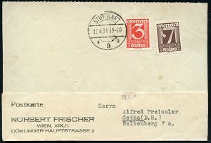 3142 | 18 € | 7000 Stuttgart Allgemeine Belege : STUTTGART/ *9o 1931 (17.6.) 1K-Brücke auf Österreich Ziffer 3 Gr. nachträglich entwertet u. 7 Gr. unentwertet, Ausl-Kt. aus Wien n. Gotha (Mi.449, 453) | ![]() | |