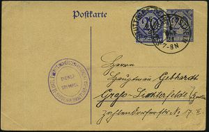 3136 | 15 € | 7000 Stuttgart Allgemeine Belege : STUTTGART-OSTHEIM 1921 (6.10.) 1K auf DP 20 Pf. blau + 20 Pf. Dienst + viol. Reichswehr-Oval-HdN: II. BATL. 1. WÜRTT. SCHÜTZEN-REGIMENT 25 , klar gest. Fern-Dienst-Kt. (Mi.DP 2 + D 26) | ![]() | |