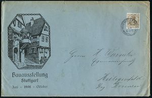 3129 | 18 € | 7000 Stuttgart Allgemeine Belege : Stuttgart-Feuerbach 1908 (26.10.) 1K: FEUERBACH P.A. Nr.1/WÜRTTEMBERG auf Reklame-Bf.: Bauausstellung Stuttgart 1908 (Gebäude, Format A5) Bedarf (Mi.84 I) | ![]() | |