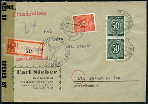 3156 | 25 € | 7000 Stuttgart Allgemeine Belege : STUTTGART-MÖHRINGEN/ a 1947 (5.2.) 2K-Steg auf Frankatur Ziffer 8 Pf. + Paar 50 Pf. + provis. RZ: Stuttgart-Möhringen (Blanco-RZ mit viol. 1L) + US-Zensurstreifen: OPENED BY/ MIL. CEN.-CIVIL MAILS + viol. Zensur-1K: U. S. CIVIL CENSORSHIP/ PASSED/ 40582/ GERMANY (= Esslingen) Firmen-R-Bf.: Carl Sieber.. n. Passau | ![]() ![]() | |