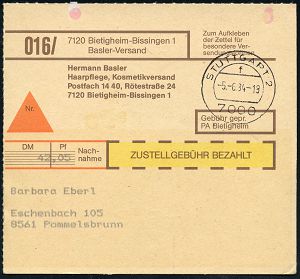 3162 | 6 € | 7000 Stuttgart Allgemeine Belege : 7000 STUTTGART 2/ f 1984 (5.6.) 1K-Segment auf Selbstbucher-NN-Paket-Kt.: Hermann Basler/ Haarpflege u. Kosmetikversand.. mit Vermerk: ZUSTELLGEBÜHR BEZAHLT (rs. Schürfung) n. Pommelsbrunn | ![]() | |