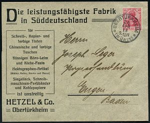 3165 | 16 € | 7000 Stuttgart Allgemeine Belege : OBERTÜRKHEIM/ a*/ (WÜRTT) 1913 (24.4.) 1K auf EF 10 Pf. Germania , dekorativer Reklame-Bf.: Die leistungsfähigste Fabrik in Süddeutschland..HETZEL & Co (Büro-Chemie) n. Engen (Mi.85 I) | ![]() | |