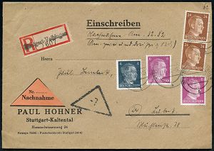 3149 | 23 € | 7000 Stuttgart Allgemeine Belege : STUTTGART-VAIHINGEN/ b 1945 (26.3.) 2K-Steg auf Dreifarben-Frankatur Hitler 4 Pf., 2x 6 Pf. u. Paar 24 Pf. = 54 Pf. + provis. RZ: Stuttgart-Vaihingen + NN-Dreieck-HdN: -7, Inl.-NN-R-Bf., später Beleg! (Mi.783, 2x 785, 2x 792) | ![]() | |