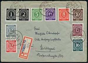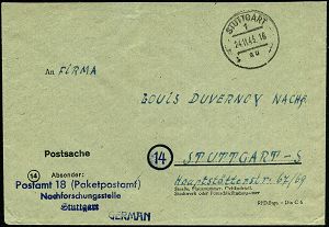 3155 | 25 € | 7000 Stuttgart Allgemeine Belege : STUTTGART/ 9/ aa 1946 (21.6.) aptierter 1K-HWSt = Text "STADT DER AUSLANDSDEUTSCHEN" entfernt + provis. RZ: Feldpost.... + blauer 1L: Stuttgart 9 b , Buntfrankatur Ziffer, Orts-R-Bf. | ![]() | |