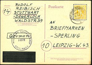 3151 | 18 € | 7000 Stuttgart Allgemeine Belege : STUTTGART-DEGERLOCH/ a 1946 (14.1.) 2K-Steg auf 6 Pf. AM-Post auf überklebter u. geschwärzter Hitler-Propaganda-P 6 Pf. als Formblatt + viol. US-Zensur-1K: 14 378 (= Esslingen), Inl.-Zensur-Kt. n.Leipzig (Mi.P 312 /Mi.4 EF) | ![]() | |