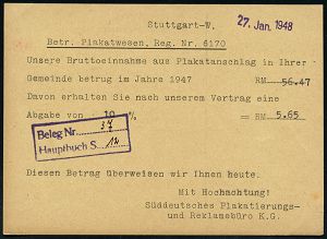 3154 | 10 € | 7000 Stuttgart Allgemeine Belege : STUTTGART/ !/ g 1946 (14.4.) aptierter 1K-HWSt = Text "STADTDER AUSLANDSDEUTSCHEN" entfernt auf EF 16 Pf. Ziffer , Firmen-Orts-Bf., rs. Abs.-Vordruck: ALOIS SEVERIN.. (Bo.56 aptiert) | ![]() | |