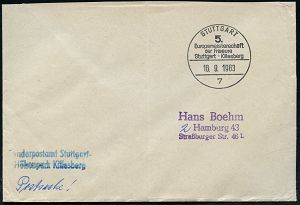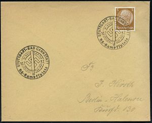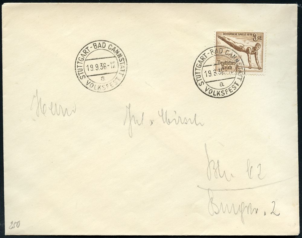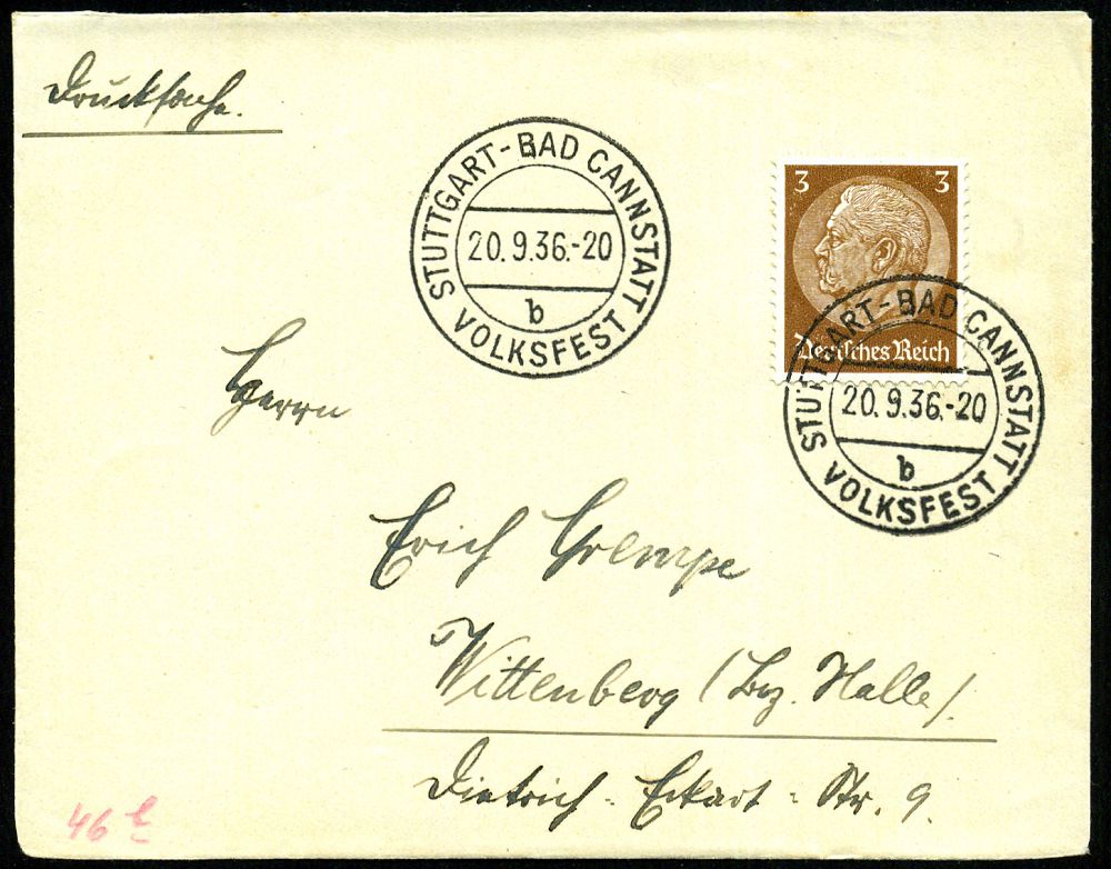 3175 | 10 € | 7000 Stuttgart Sonder- & Hand-Werbestempel : STUTTGART-BAD CANNSTATT/ b/ V O L K S F E S T 1936 (20.9.) 2K-SSt , 2x klar auf Bedarfs-Vorderseite (Bo.48 b, II. Verwendung) | ![]() | |