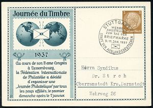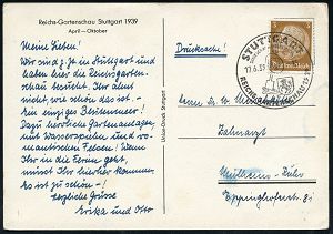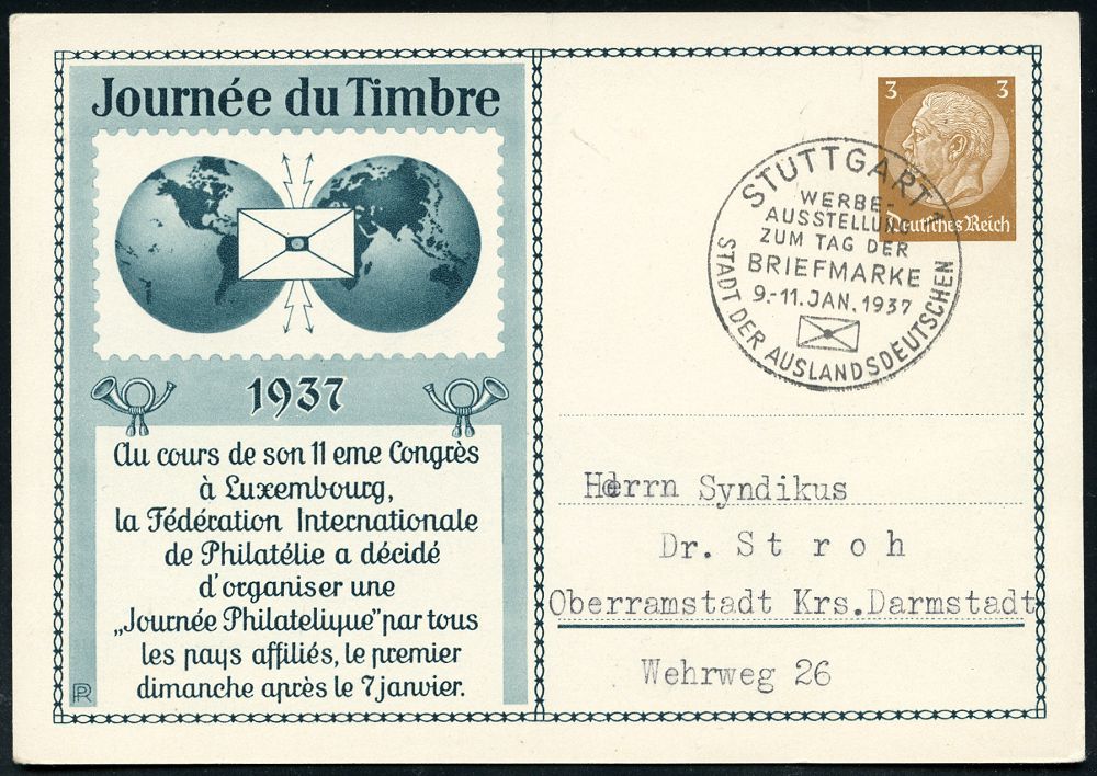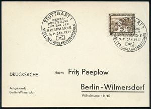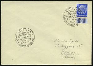 3176 | 8 € | 7000 Stuttgart Sonder- & Hand-Werbestempel : STUTTGART 1/ SDA/ WERBE-/ AUSST./ ZUM TAG DER/ BRIEFMARKE 1937 (Jan.) SSt (Brief) 2x klar auf Inl.-Drs.-Kt. (Bo. 55) | ![]() | |