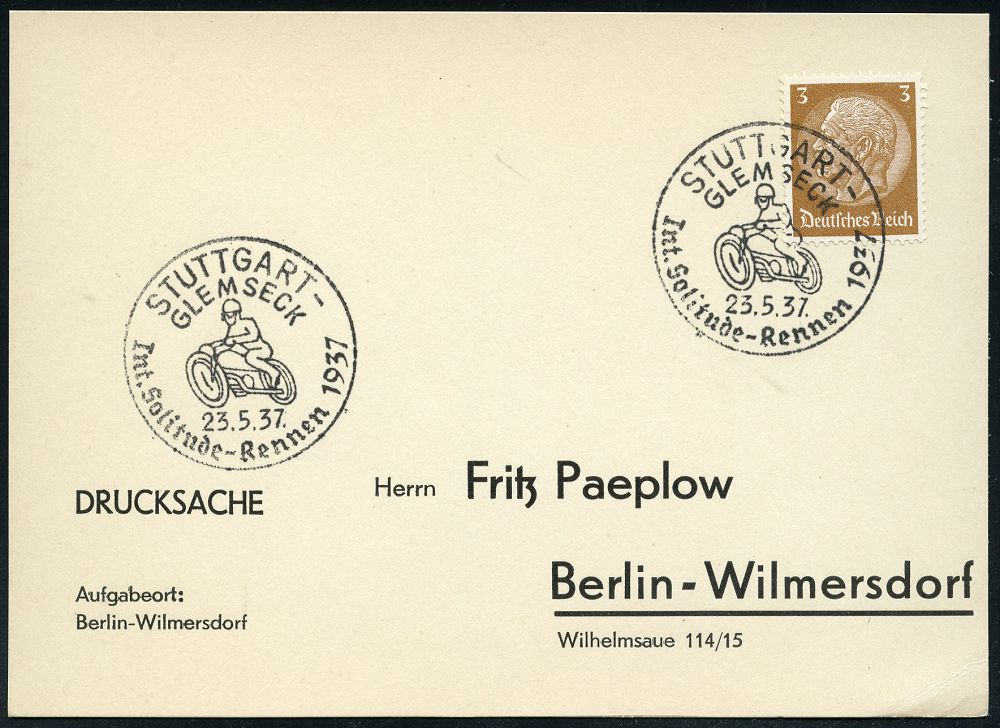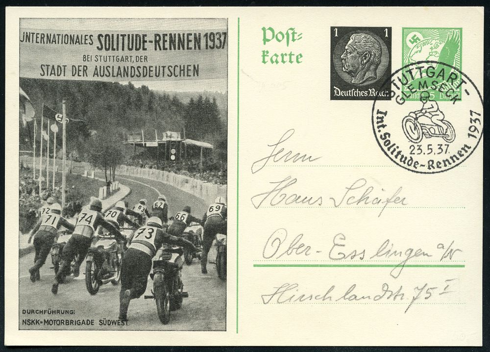3180 | 12 € | 7000 Stuttgart Sonder- & Hand-Werbestempel : STUTTGART-/ GLEMSECK/ Int.Solitude-Rennen 1937 (23.5.) SSt = Rennmotorrad , klar gest. Inl.-Drs.-Kt. (Bo.61) | ![]() | |