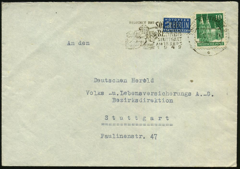 3200 | 18 € | 7000 Stuttgart Sonder- & Hand-Werbestempel : (14a) STUTTGART 9/ o/ BESUCHET DAS/ SOLITUDE-/ RENNEN/ AM 18.SEPT. 1949 (6.9.) MWSt = Rennmotorrad (u. Formel-Rennauto, Schloß) Sieger Rennautos: Toni Ulmen (auf Veritas), Bedarfs-Ortsbf. (Bo.119 A II) | ![]() | |