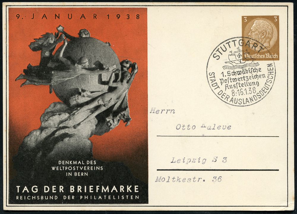 3184 | 18 € | 7000 Stuttgart Sonder- & Hand-Werbestempel : STUTTGART/ SDA/ 1.Schwäb./ Postwertzeichen/ Ausstellung 1938 (Jan.) SSt zum Tag der Briefmarke auf passender PP 3 Pf. Hindenbg. braun: DENKMAL DES WELTPOSTVEREINS IN BERN in rot (Mi.PP 122/C 70-02, klar gest. Inl.-Karte (Bo.69) | ![]() | |