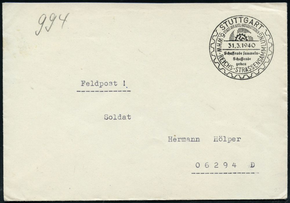 3191 | 18 € | 7000 Stuttgart Sonder- & Hand-Werbestempel : STUTTGART/ SDA/ 6.WHW-REICHS-STRASSENSAMMLUNG 1940 (31.3.) SSt glasklar auf Feldpost-Bf.! (Bo.85) | ![]() | |