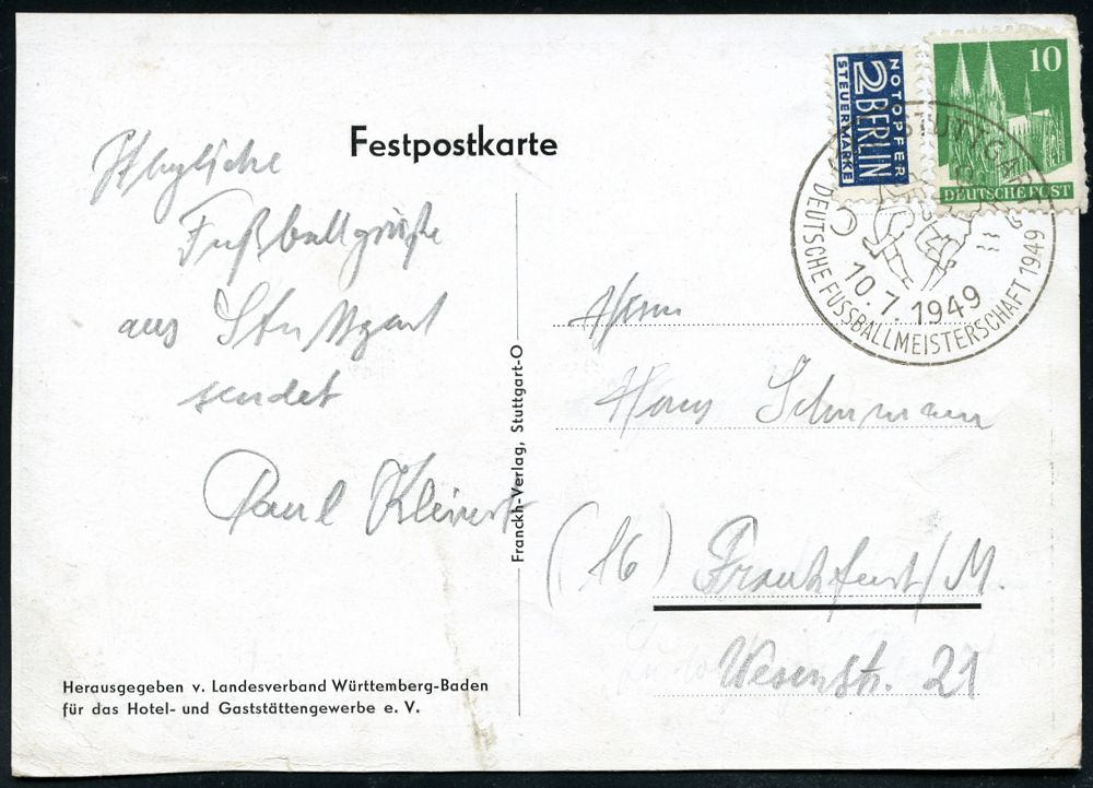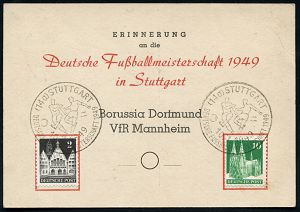 3198 | 22 € | 7000 Stuttgart Sonder- & Hand-Werbestempel : (14a) STUTTGART/ DEUTSCHE FUSSBALLMEISTERSCHAFT 1949 (10.7.) SSt = 2 Spieler mit Ball 3x vs und rs.) klar gest. Sonder-Kt.: Deutsche Fußballmeisterschaft.. Borussia Dortmund, VfR Mannheim (Michaelis Nr.6 a, + 25.- DM, 1991) 1x rs. auf 2 Pf. NoB, Bedarf (Bo.117) | ![]() ![]() | |