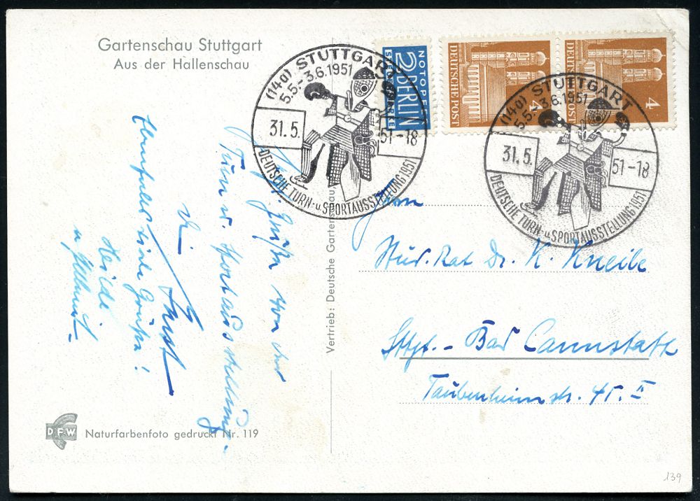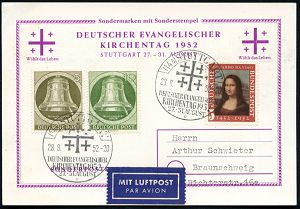 3209 | 30 € | 7000 Stuttgart Sonder- & Hand-Werbestempel : (14a) STUTTGART/ DEUTSCHER EVANGELISCHER/ KIRCHENTAG 1952 (28.8.) SSt = Jerusalem-Kreuz 2x glasklar auf 5 u. 10 Pf. Glocke + 5 Pf. Mona Lisa (Mi.149, Bln. Mi.82/83 + 30.- EUR) motivgl. Sonder-Kt.: "Wählt das Leben" (Michaelis Nr.14, + 30.-DM, 1991) portorichtige Inl.-Flp.-Kt., rs. mit viel Text ! (Bo.166) | ![]() ![]() | |