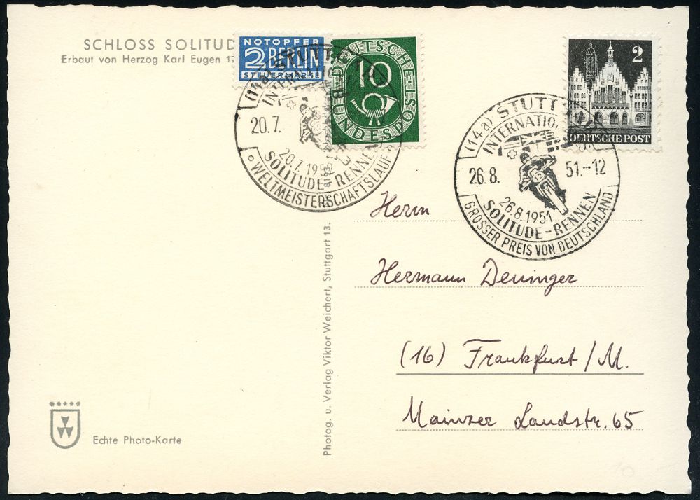 3205 | 25 € | 7000 Stuttgart Sonder- & Hand-Werbestempel : (14a) STUTTGART/ INT.SOLITUDE-RENNEN/ WELTMEISTERSCHAFTSLAUF 1952 (20.7.) SSt + SSt. SOLITUDE-RENNEN von 1951 auf 2 Pf. Bauten auf s/w.-Foto-Ak.: Schloss Solitude = Start u. Ziel der Rennstrecke (Bo.148 + 162) | ![]() ![]() | |