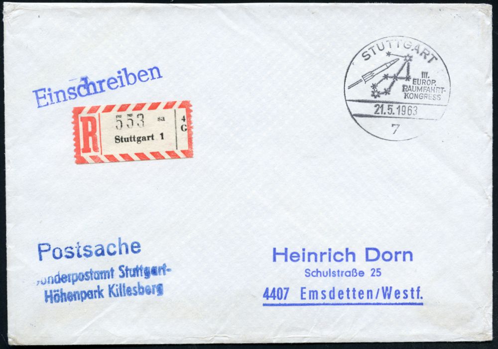 3221 | 18 € | 7000 Stuttgart Sonder- & Hand-Werbestempel : 7 STUTTGART/ III.EUROP./ RAUMFAHRT-/ KONGRESS 1963 (21.5.) SSt = Sternbield "Stier" + RZ ohne PLZ: Stuttgart 1/s a + bl. Abs.-2L: Sonderpostamt Stuttgart-Höhenpark Killesberg , markenloser Postdienst-R-Brief (Bo.304) | ![]() | |