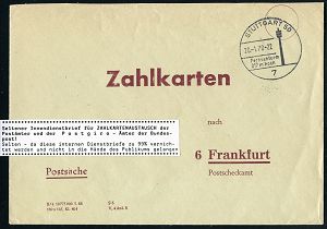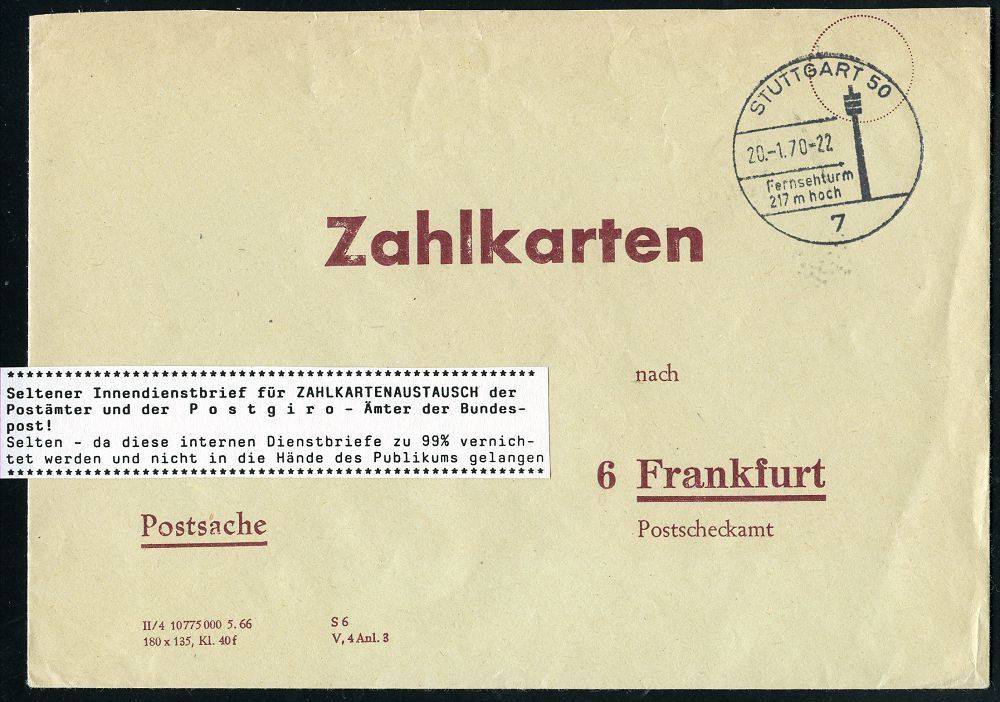 3225 | 18 € | 7000 Stuttgart Sonder- & Hand-Werbestempel : 7 STUTTGART 50/ Fernsehturm/ 217m hoch 1970 (20.1) HWSt (Fernsehturm) klar auf Posscheck-Innendienst-Bf.: Zahlkarten PSchAmt Ffm, seltene Verwendung! (Bo.439 II, Bo. 1970 unbekannt) | ![]() | |