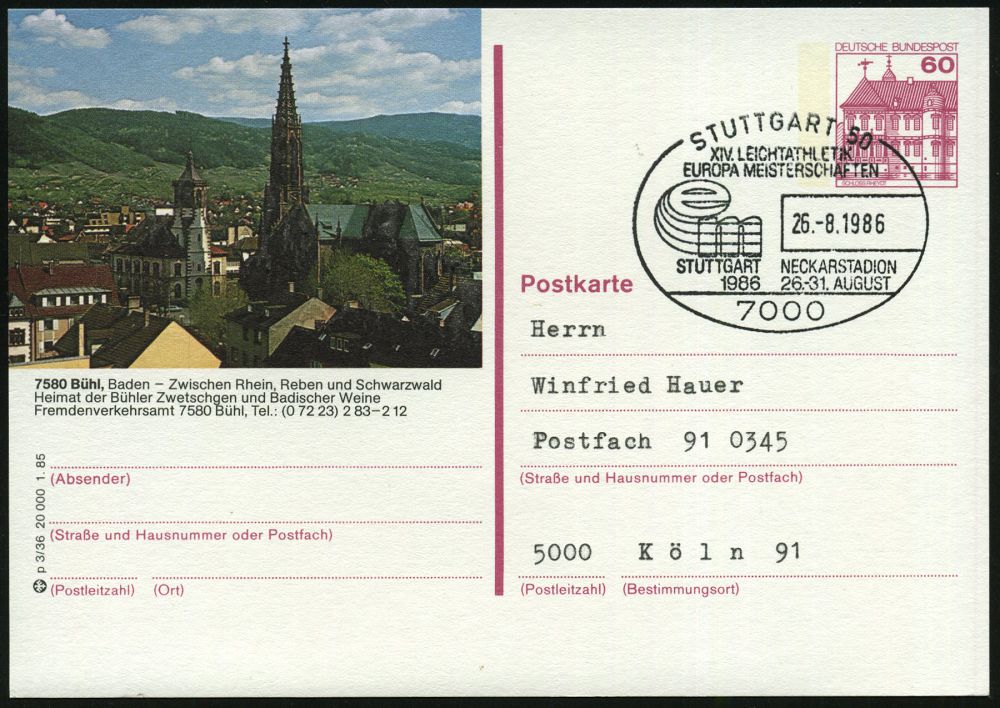 3231 | 16 € | 7000 Stuttgart Sonder- & Hand-Werbestempel : 7000 STUTTGART 50/ XIV.LEICHTATHLETIK./ EUROPAMEISTERSCHAFTEN 1986 (Juli/Aug.) SSt u n d motivgleicher AFS (je Logo) klar auf Inl.-Kt. bzw. Inl.-Bf., 2 Belege | ![]() ![]() | |