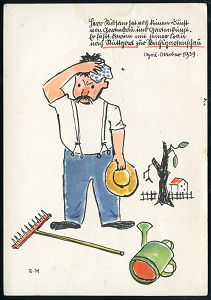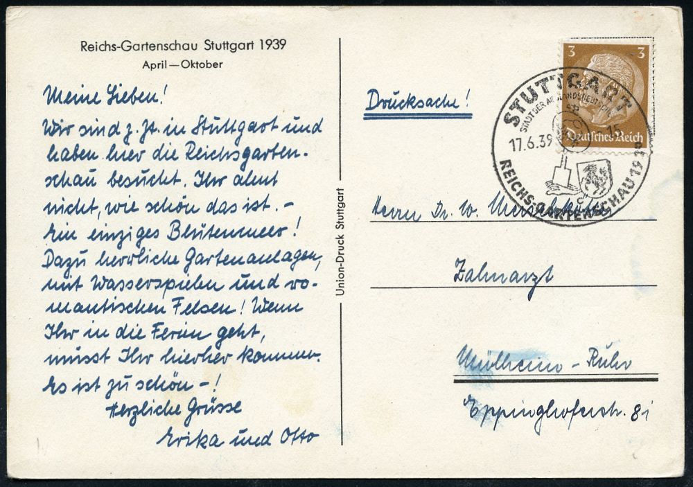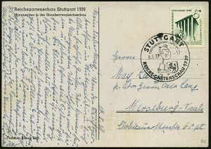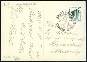 3186 | 25 € | 7000 Stuttgart Sonder- & Hand-Werbestempel : STUTTGART/ SDA/ c/ REICHS-GARTENSCHAU 1939 (17.6.) SSt = Spaten u. Sonnenhut (u. Stadtwappen) auf seltener Color-Künstler-Ak.: Reichs-Gartenschau.. (schwitzender Gärtner, sign. R. M.), Bedarf (Bo.81 c) | ![]() ![]() | |