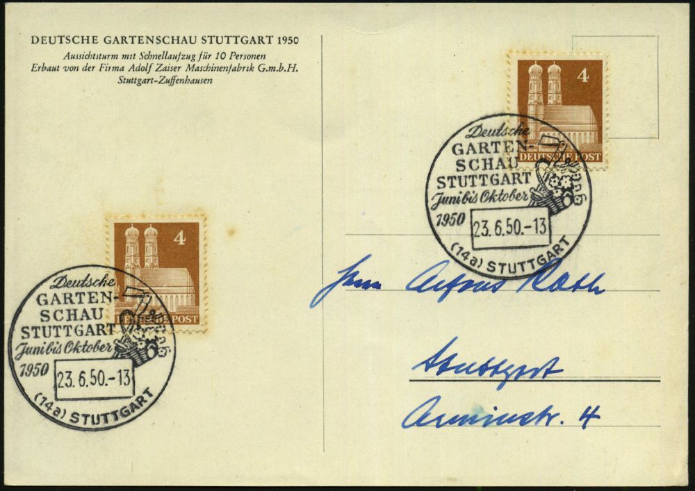 3201 | 22 € | 7000 Stuttgart Sonder- & Hand-Werbestempel : (14a) STUTTGART/ Deutsche/ GARTEN-/ SCHAU 1950 (23.6.) SSt (Blumenkorb, Hacke) auf seltener Color-Ausst.-Sonder-Kt.: DEUTSCHE GARTENBAU-AUSSTELLUNG der Aufzug-Firma Zaiser (Bugspur), Michaelis unbekannt! mit Abb. aiser-Aufzug u. Aussichtsturm, portorichtige Orts-Kt. (Bo.124) | ![]() ![]() | |