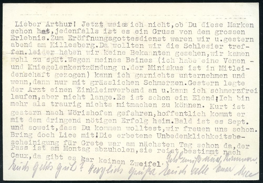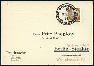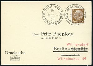 3172 | 14 € | 7000 Stuttgart Sonder- & Hand-Werbestempel : STUTTGART/ DT/ 15,Deutsches Turnfest 1933 (26.7.) SSt Type II (Monogr. "DT" = Deutscher Turnerbund) klar auf Inl.-Drs.-Kt. (Bo.35, Type II) | ![]() | |