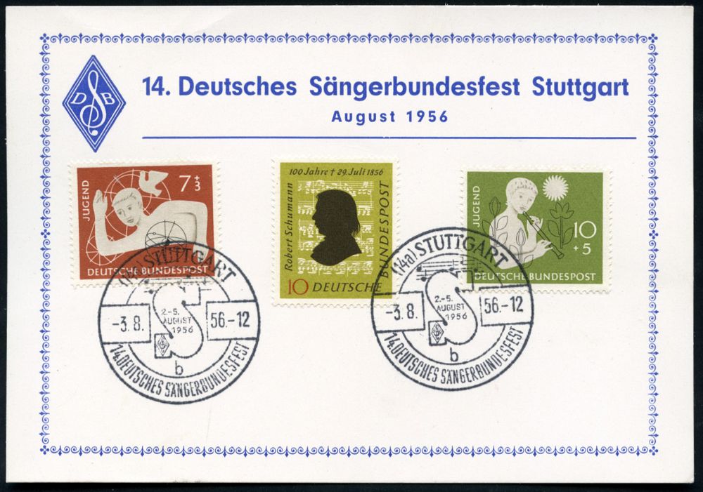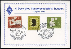 3214 | 18 € | 7000 Stuttgart Sonder- & Hand-Werbestempel : (14a) STUTTGART/ b/ 14.DEUTSCHES SÄNGERBUNDESFEST 1956 (3.8.) SSt = Notenzeile 2x rs. auf Sonder-Kt. (Michaelis Nr.23, + 15.-DM, 1991) klar gest. Ausl.-Kt. mit Schumann-Frankatur (Bo.218 b) | ![]() | |