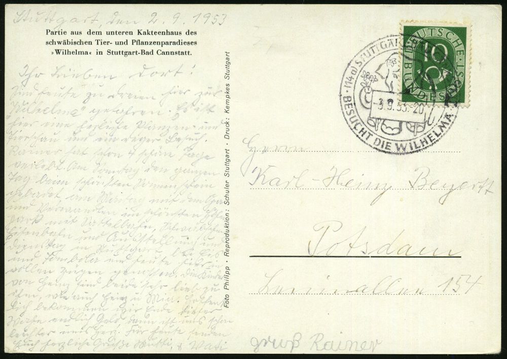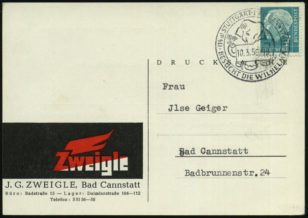 3217 | 12 € | 7000 Stuttgart Sonder- & Hand-Werbestempel : (14a) STUTTGART-BAD CANNSTATT/ BESUCHT DIE WILHELMA 1956 (10.3.) HWSt = Elefant (m. Blumen) dekorative Orts-Firmenkt.: Zweigle (Bo.164 , Type II) | ![]() ![]() | |
