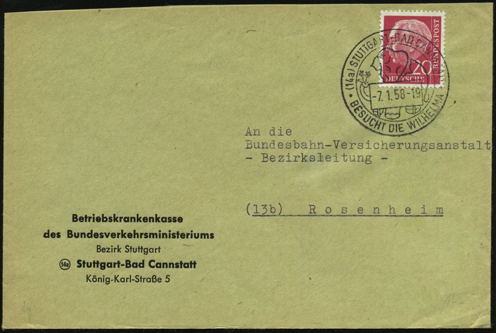 3216 | 12 € | 7000 Stuttgart Sonder- & Hand-Werbestempel : (14a) STUTTGART-BAD CANNSTATT/ BESUCHT DIE WILHELMA 1958 (7.1.) HWSt = Elefant (m. Blumen) klar gest. Dienst-Bf.: Betriebskrankenkasse Bunderverkehrsministerium (Bo.164 , Type III) | ![]() | |