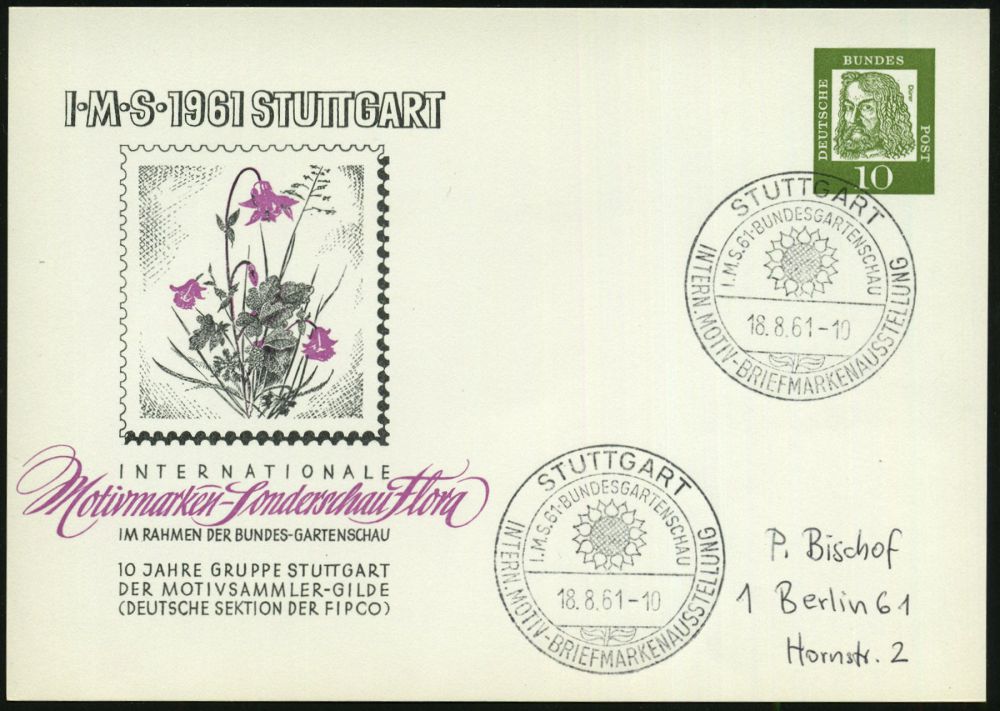3218 | 15 € | 7000 Stuttgart Sonder- & Hand-Werbestempel : STUTTGART/ I.M.S. 61.BUNDESGARTENSCHAU/ INT.MOTIV-BRIEFM.-AUSST. 1961 (18.8.) SSt = Sonnenblume auf passender PP 10 Pf. Dürer: I.M.S. (Mi.PP 24/2) Inl.-Karte (Bo.274 / 1.Tag) | ![]() | |