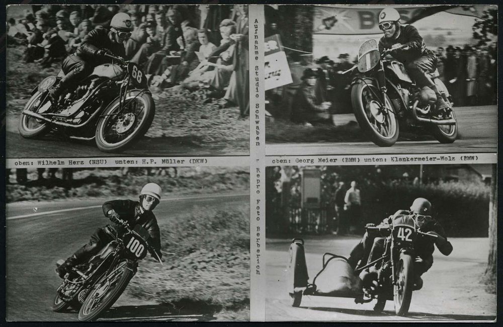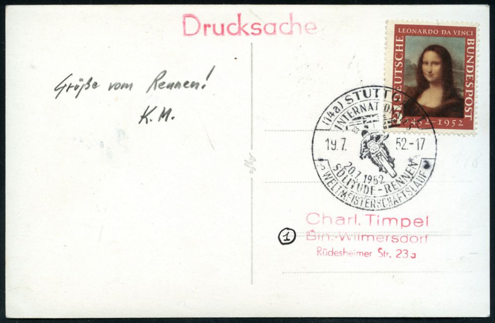 3208 | 25 € | 7000 Stuttgart Sonder- & Hand-Werbestempel : (14a) STUTTGART/ INTERNAT./ SOLITUDE-RENNEN/ WELTMEISTERSCHAFTSLAUF 1952 (19.7.) SSt = Rennmotorrad (u. Flaggen) s/w.-Foto-Sonder-Ak. Solitude-Rennen (= Zwischenrennen 19.7.) seltene Sonder-Kt., Michaelis unbekannt! (Bo.162 , 3.Renntag) | ![]() ![]() | |