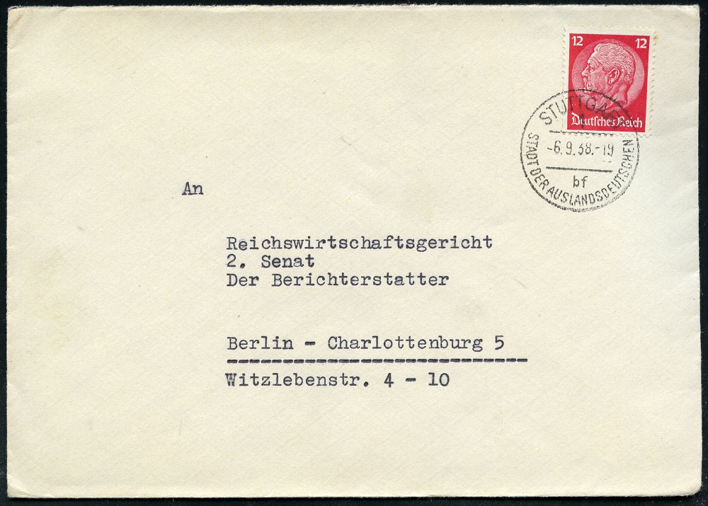 3185 | 6 € | 7000 Stuttgart Sonder- & Hand-Werbestempel : STUTTGART1/ bf/ STADT DER AUSLANDSDEUTSCHEN 1938 (6.9.) 1K-HWSt klar auf Fern-Bf. an Reichswirtschaftsgericht (Bo.56) | ![]() | |