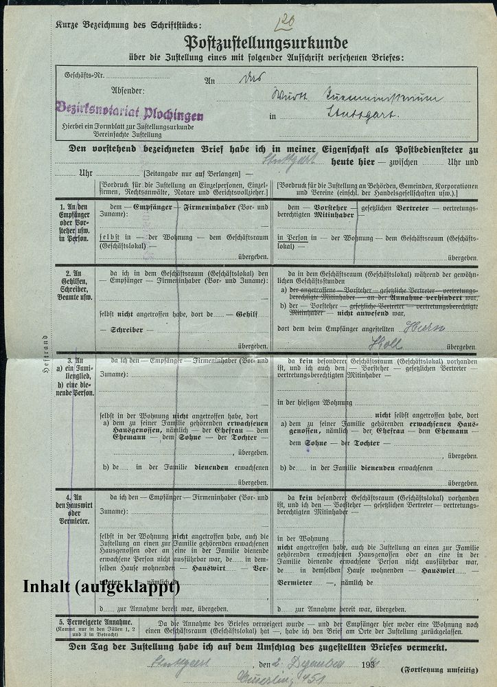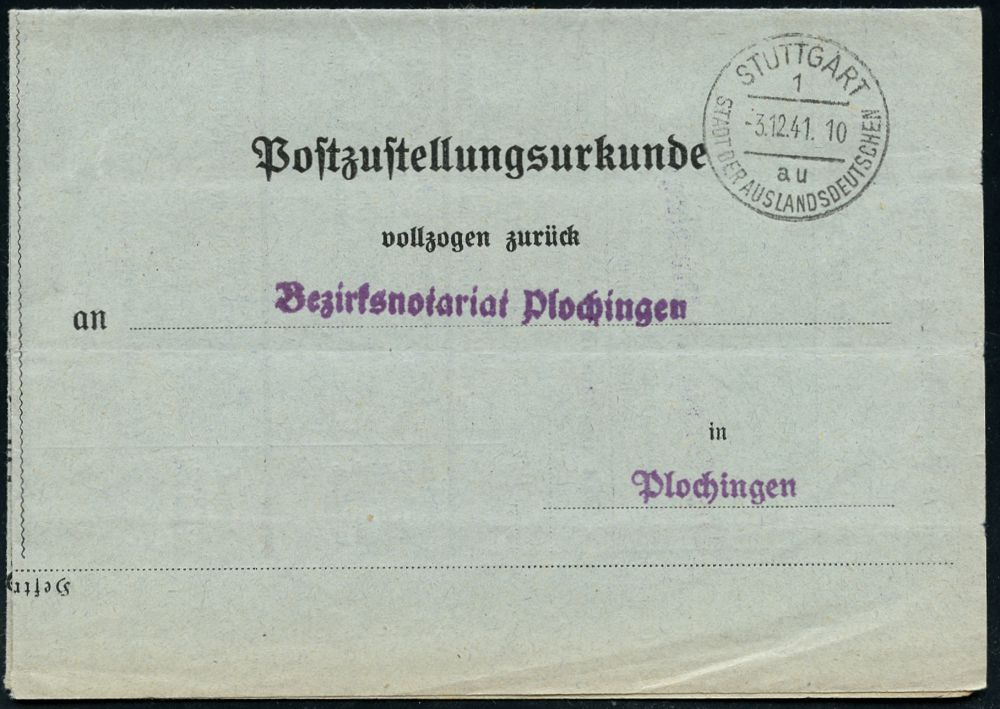 3192 | 18 € | 7000 Stuttgart Sonder- & Hand-Werbestempel : STUTTGART/ 1/ au/ STADT DER AUSLANDSDEUTSCHEN 1941 (3.12.) 1K-HWSt auf markenloser Postzustellungsurkunde + Inhalt! n. Plochingen, seltene Verwendung! (Bo.56) | ![]() ![]() | |