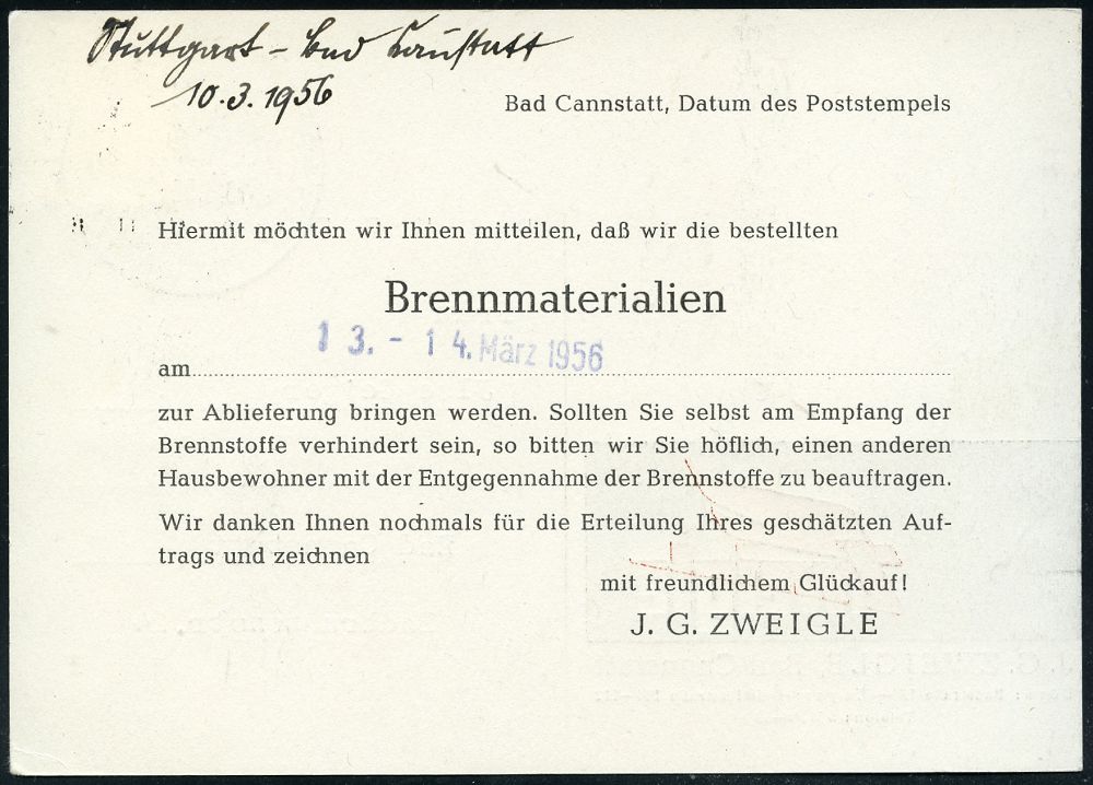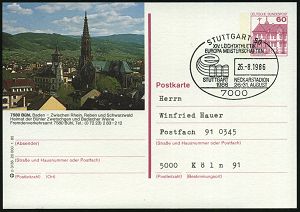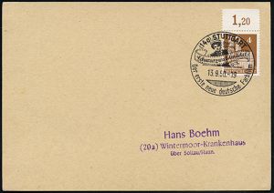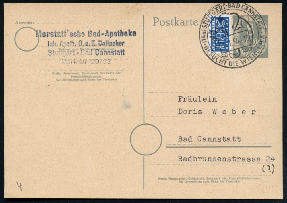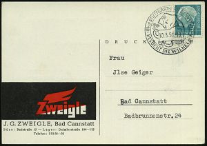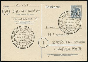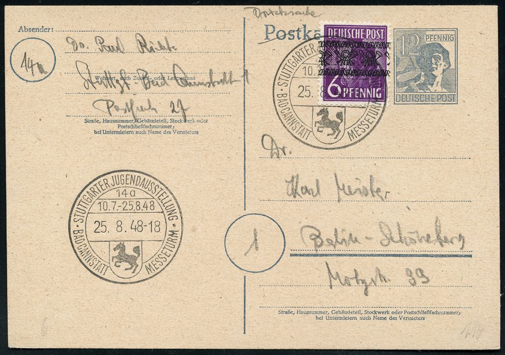 3197 | 15 € | 7000 Stuttgart Sonder- & Hand-Werbestempel : BAD CANNSTATT MESSETURM/ STUTTGARTER JUGENDAUSSTELLUNG 1948 (25.8.) SSt (Stadtwappen) auf P 12 Pf. Arbeiter als Formblatt , EF 6 Pf. Posthorn-Bandaufdruck (Mi.37 I, EF + 10.- EUR), klar gest. Inl.-Drs.-Kt. (Bo.110) | ![]() | |
