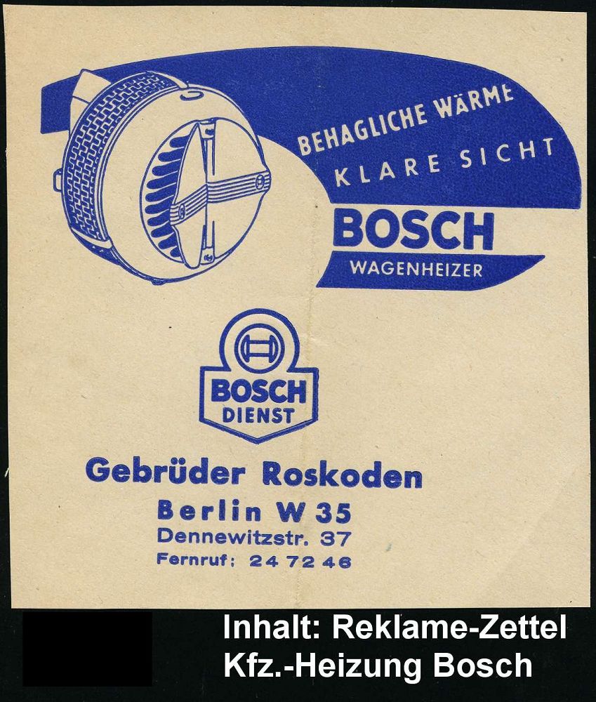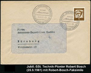 3219 | 15 € | 7000 Stuttgart Sonder- & Hand-Werbestempel : STUTTGART/ ROBERT BOSCH VOR 100 JAHREN GEBOREN 1961 (25.9.) SSt (R. Bosch-Faksimile) klar gest. Inl.-Drs.-Bf. + orig. Reklame-Zettel: Fa. R. Bosch mit Kfz.-Heizung, 2 Belege (Bo.281) | ![]() ![]() | |