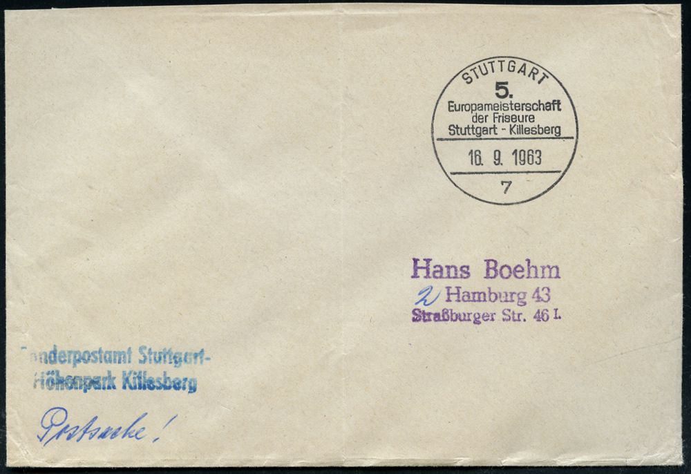 3222 | 14 € | 7000 Stuttgart Sonder- & Hand-Werbestempel : 7 STUTTGART/ 5.Europameisterschaft/ de Friseure.. 1963 (16.9.) SSt + blauer Abs.-2L: Sonderpostamt Stuttgart/ Höhenpark Killesberg , klar gest. Postdienst-Bf. (Bo.314) | ![]() | |
