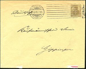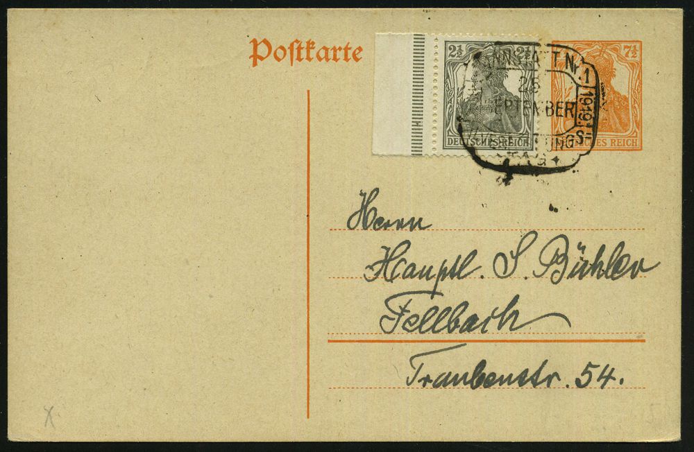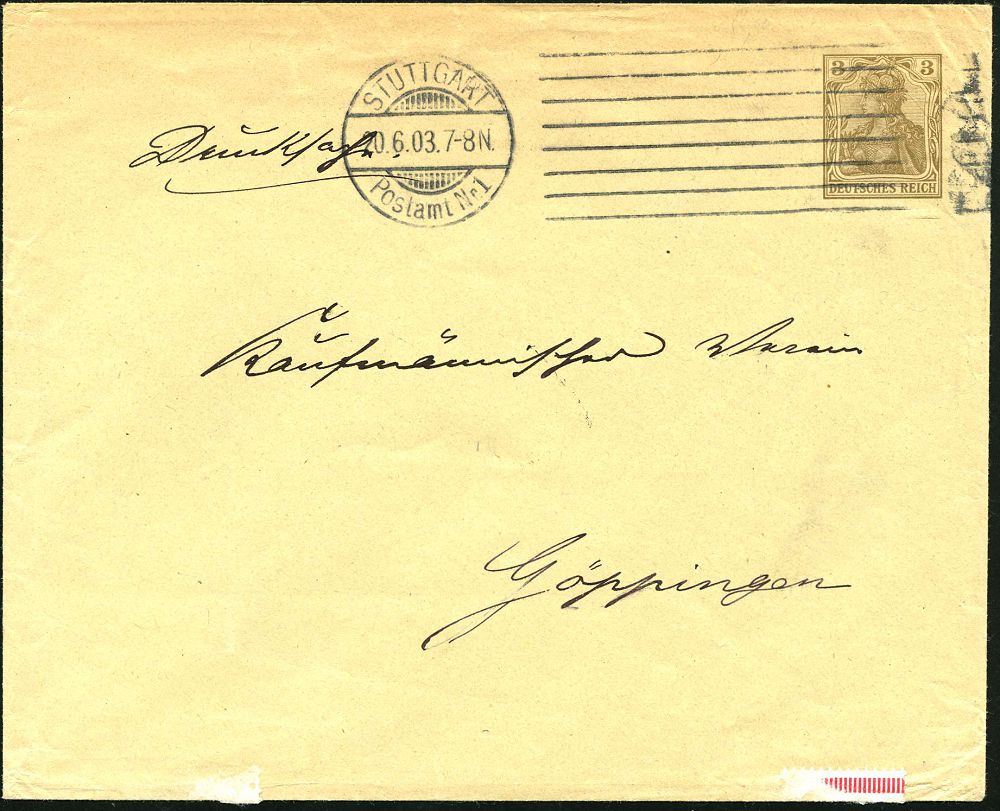 3235 | 30 € | 7000 Stuttgart Sonder- & Hand-Werbestempel : STUTTGART/ Postamt Nr. 1 1903 (20.6.) MaStrichSt. Bickerdike (8 lange Striche, rechts) klar auf PU 3 Pf. Germania ohne Vordruck (ME.PU 24/A2) Inl.Drs., (Miller.97 = Frühdatum!) | ![]() | |