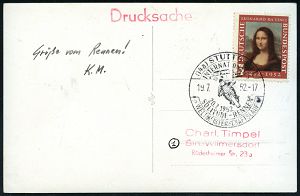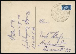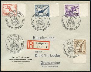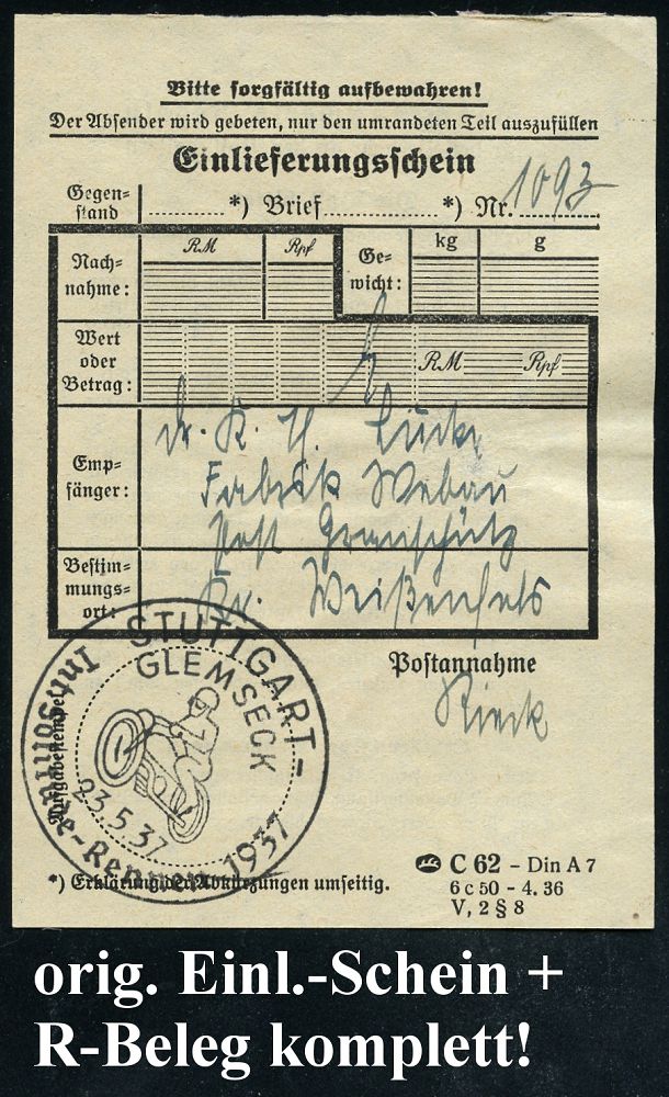 3181 | 35 € | 7000 Stuttgart Sonder- & Hand-Werbestempel : STUTTGART-/ GLEMSECK/ Int.Solitude-Rennen 1937 (23.5.) SSt = Rennmotorrad 5x auf besserer Olympia-Frankatur (Mi.616 u.a. + 25.- EUR) + RZ: Stuttgart 1/z + R-Einl.-Schein mit gl. SSt., Inl.-R-Bf., 2 Belege kompl.! + Faksimile der Rennstrecke! (Bo.61) | ![]() ![]() ![]() | |