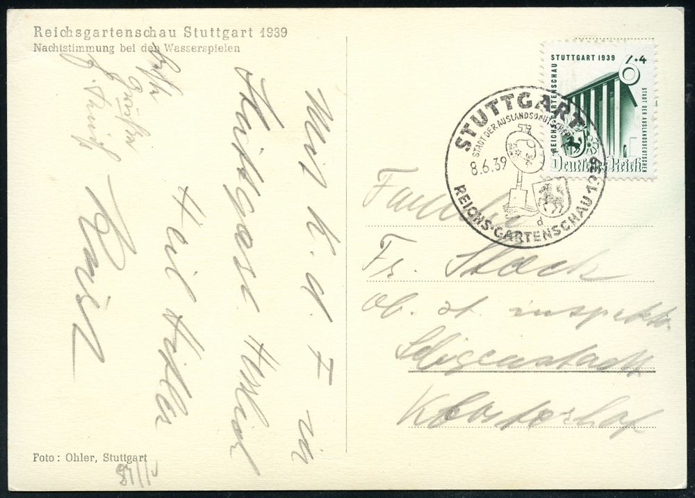 3188 | 25 € | 7000 Stuttgart Sonder- & Hand-Werbestempel : STUTTGART/ SDA/ d/ REICHS-GARTENSCHAU 1939 (8.6.) SSt (Spaten, Hut etc.) auf EF 6 + 4 Pf. Gartenschau (Mi.692, EF, + 20.-EUR) , s/w.-Ausst.-Sonder-Kt.: nächtliche Wasserspiele, Bedarf (Bo.81 d) | ![]() ![]() | |