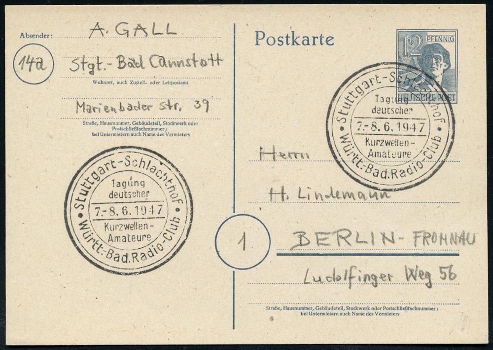 3194 | 16 € | 7000 Stuttgart Sonder- & Hand-Werbestempel : Stuttgart-Schlachthof/ Tagung/ deutscher/ Kurzwellen-/ Amateure/ Württ.-Bad.Radio-Club 1947 (Juni) SSt klar auf Inl.-P. 12 Pf. n. West-Berlin (Bo.101) | ![]() | |