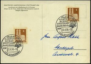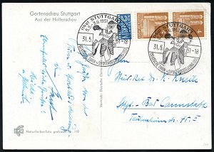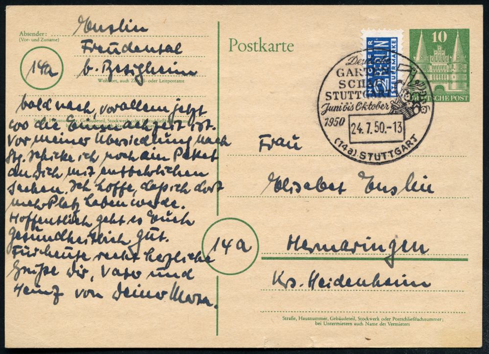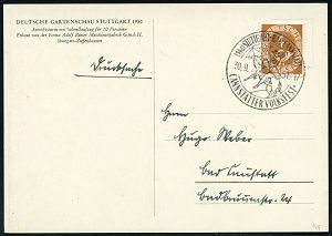 3202 | 15 € | 7000 Stuttgart Sonder- & Hand-Werbestempel : (14a) STUTTGART/ Deutsche/ GARTEN-/ SCHAU 1950 (24.7.) SSt (Blumenkorb, Hacke) auf Inl.-P 10 Pf. Holstentor, grün, glasklar gest. Bedarfs-Kt. mit viel Text (minim. Randspuren) (Bo.124) | ![]() | |