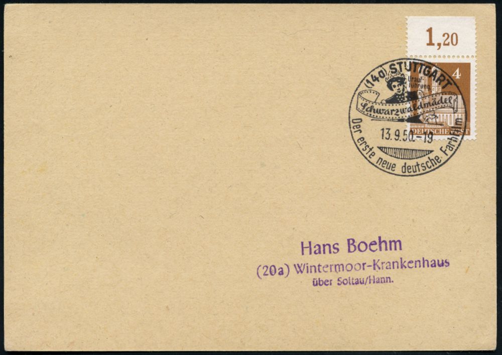 3203 | 14 € | 7000 Stuttgart Sonder- & Hand-Werbestempel : (14a) STUTTGART/ ...Schwarzwaldmädel/ Der erst neue deutsche Farbfilm 1950 (13.9.) SSt (Frau in Tracht) klar auf Inl.-Drs.-Karte (Bo.133) | ![]() | |