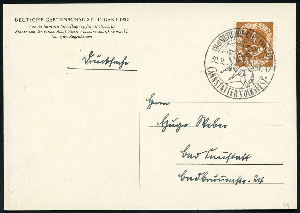 3206 | 25 € | 7000 Stuttgart Sonder- & Hand-Werbestempel : (14a) STUTTGART-BAD CANNSTATT/ CANNSTATTER VOLKSFEST 1951 (30.9.) SSt (Frau m.Lebkuchenherz auf Karussel-pferd) klar gest. Color-Reklame-Ak: Deutsche Gartenschau 1950 (Michaelis unbekannt!) der Aufzug-Fa. A. Zaiser (Aussichtsturm) Bedarf (Bo.149 / I.Verwendung) | ![]() ![]() | |