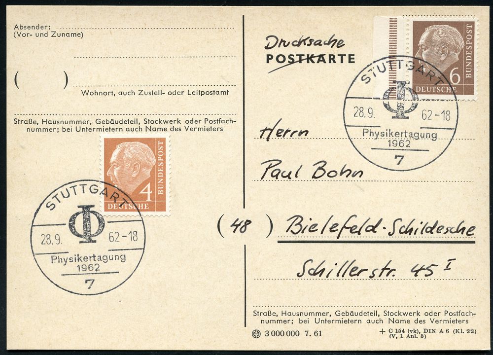 3220 | 15 € | 7000 Stuttgart Sonder- & Hand-Werbestempel : 7 STUTTGART/ Physikertagung 1962 (28.9.) SSt (griech. Buchstabe "Phi") 2x klar auf Inl.-Karte (Bo.297) | ![]() | |