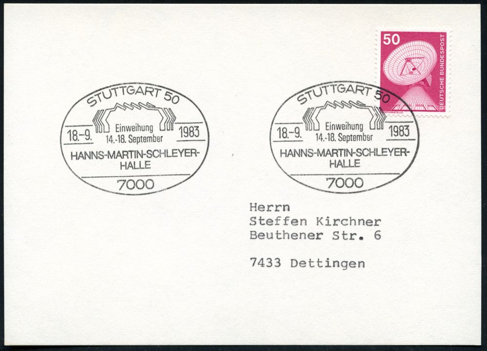 3229 | 12 € | 7000 Stuttgart Sonder- & Hand-Werbestempel : 7000 STUTTGART 50/ Einweihung../ HANNS-MARTIN-SCHLEYER-/ HALLE 1983 (18.9.) SSt (stilis. Halle) 2x klar auf Inl.Karte, M. Schleyer, 1915 - 1977, SS-Mitglied, CDU-Mitglied ab 1970, Daimler-Benz-Aufsichtsrat, BDA-Präsident, 1977 von der R.A.F. ermordet | ![]() | |